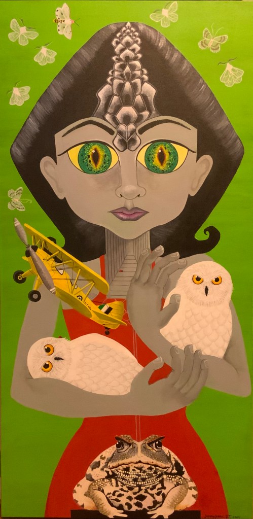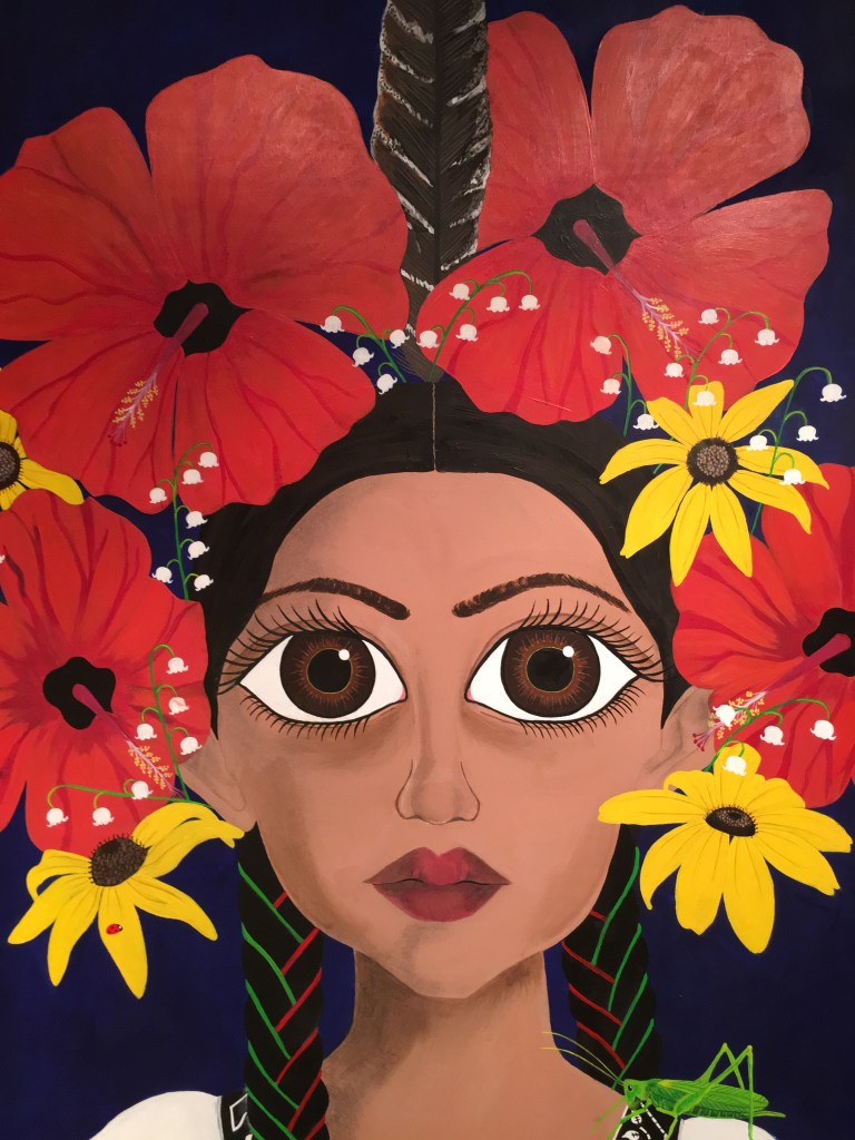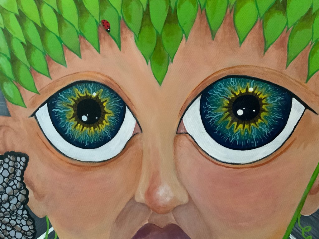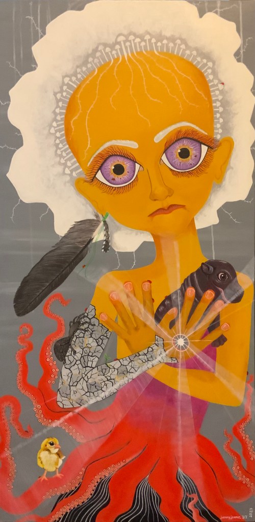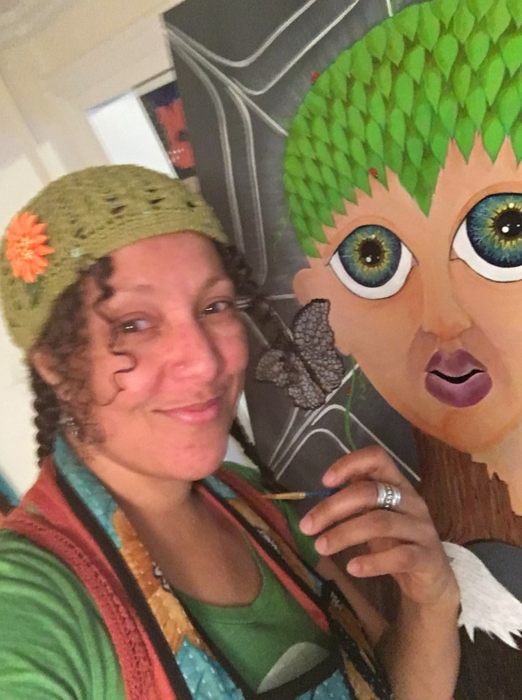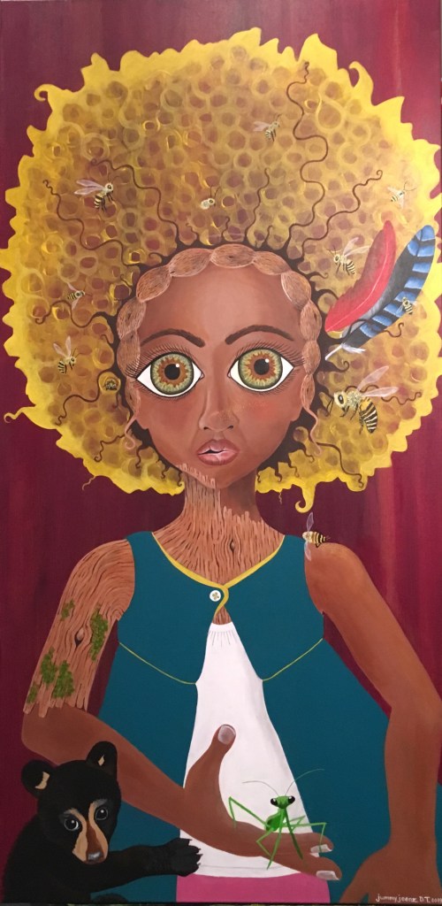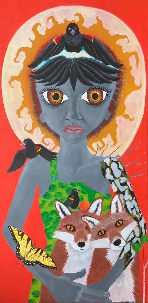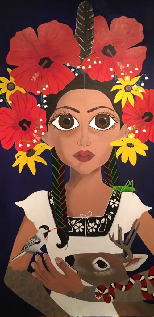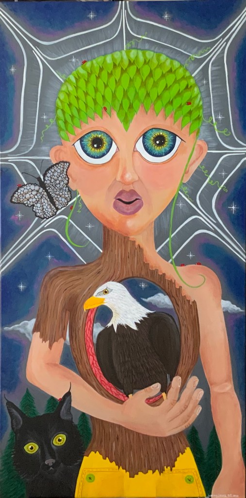 The bold colors of the acrylic always set my imagination free. Most of my images start with a very simple concept like a vision of a yellow bird, inspiration in nature, or dream worlds. Once that image is on the canvas the rest begins to take shape organically around it and new inspiration finds its way in as the days unfold. Social issues also greatly influence my work along with underrepresented groups within our society. I look at each one of these humans as a representations of all of humanity and at the same time self portraits as well. After all we are all interconnected! I believe that it’s important to see ourselves within one another.