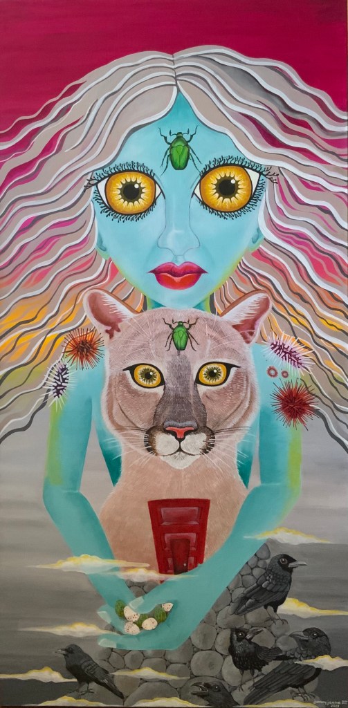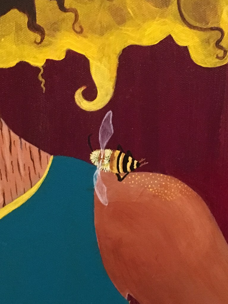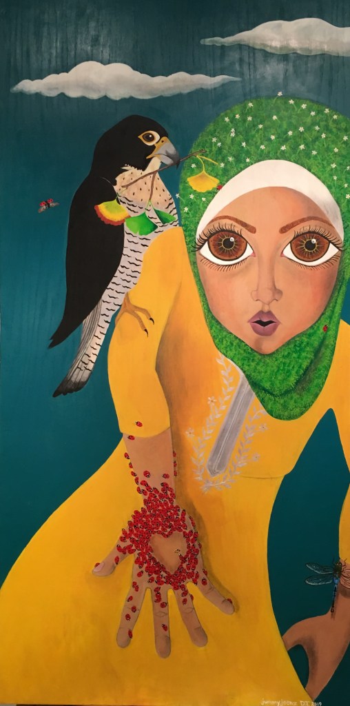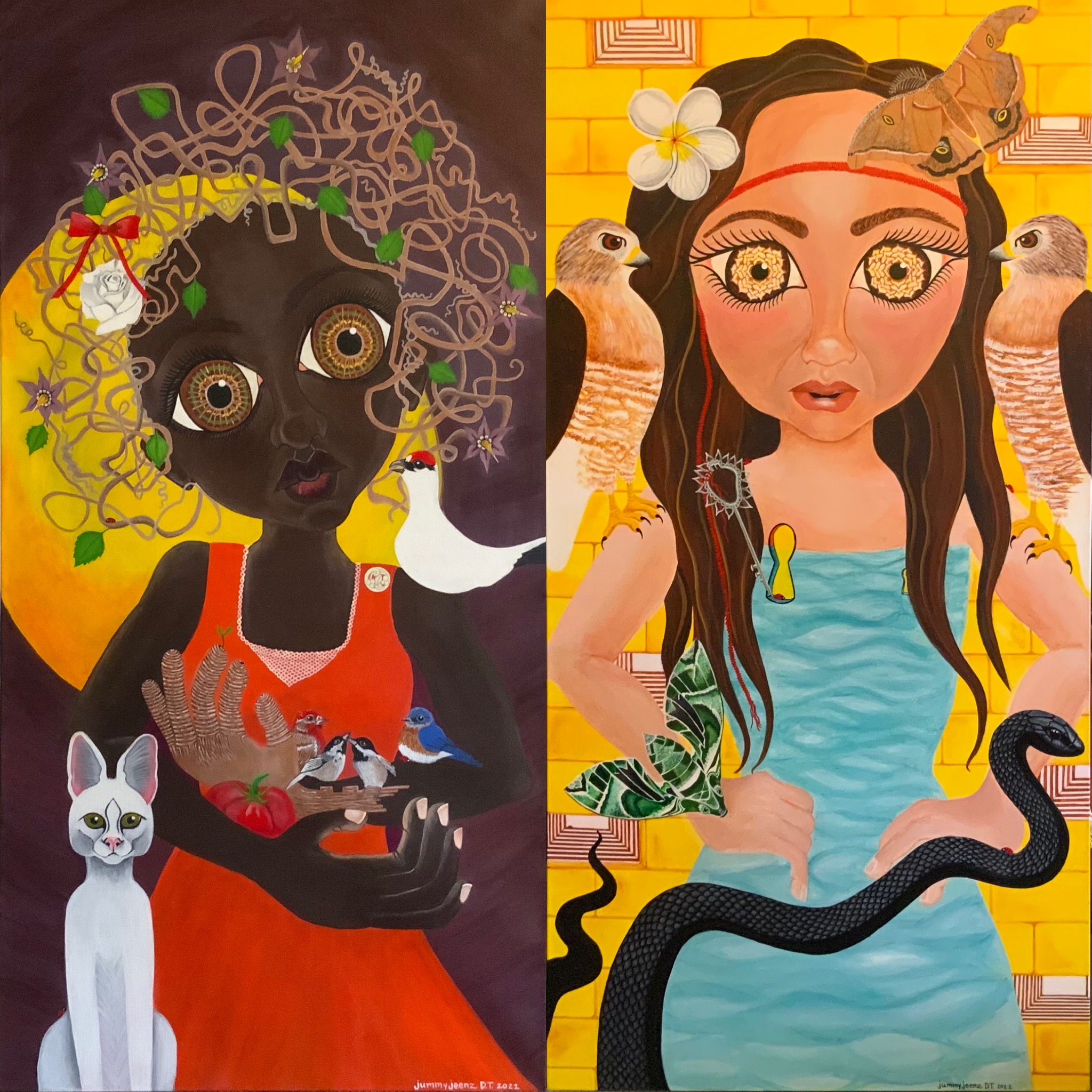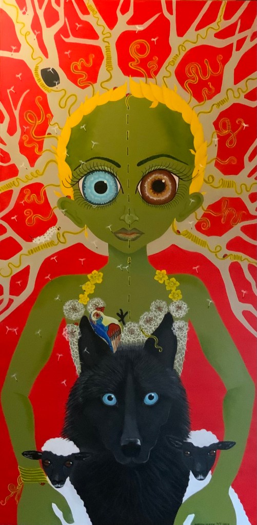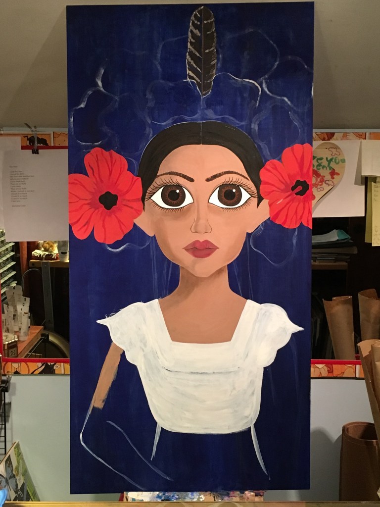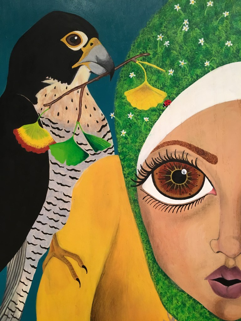 The bold colors of the acrylic always set my imagination free. Most of my images start with a very simple concept like a vision of a yellow bird, inspiration in nature, or dream worlds. Once that image is on the canvas the rest begins to take shape organically around it and new inspiration finds its way in as the days unfold. Social issues also greatly influence my work along with underrepresented groups within our society. I look at each one of these humans as a representations of all of humanity and at the same time self portraits as well. After all we are all interconnected! I believe that it’s important to see ourselves within one another.