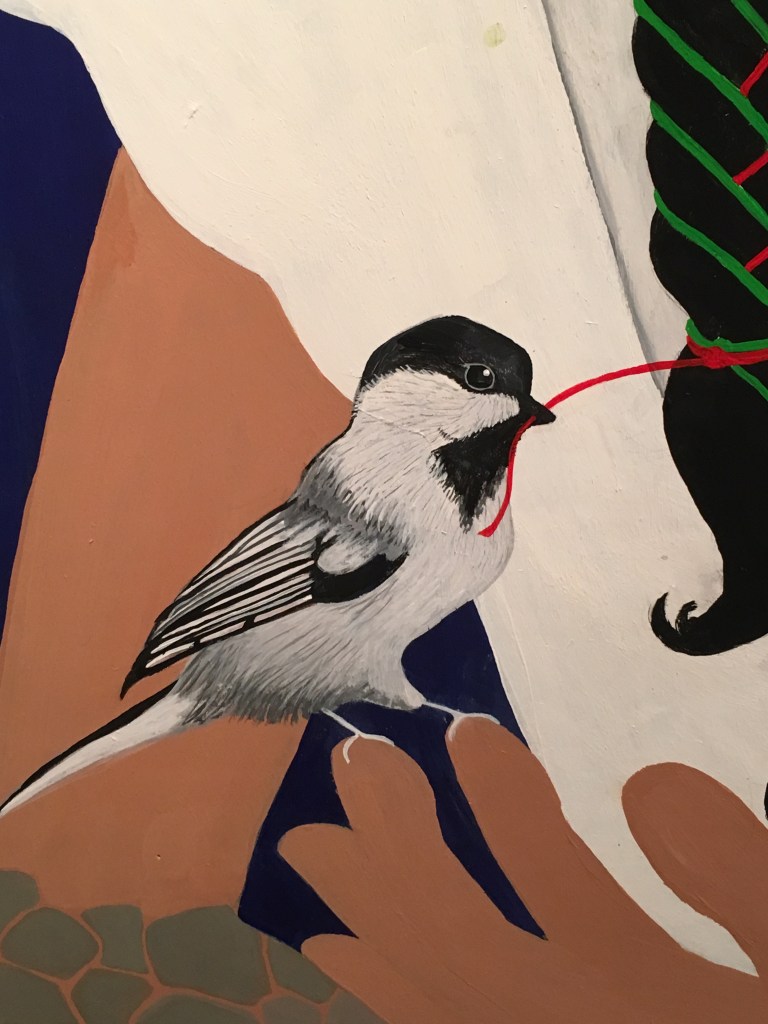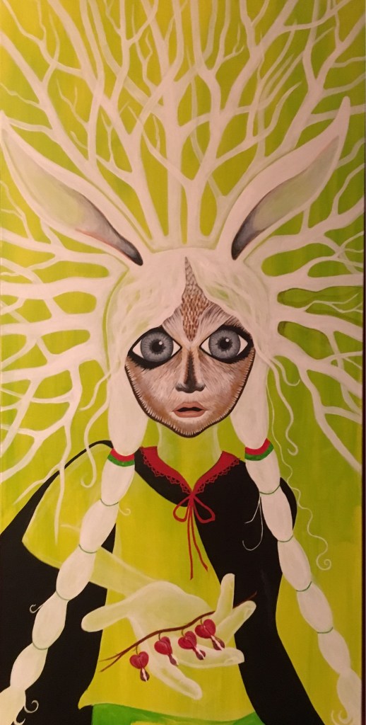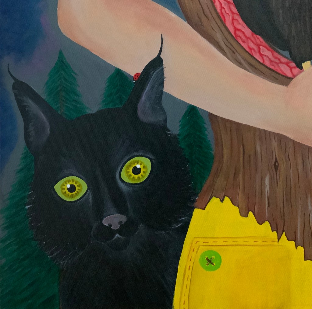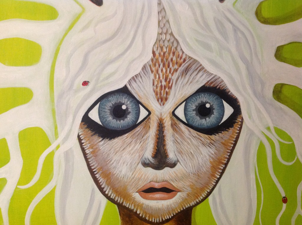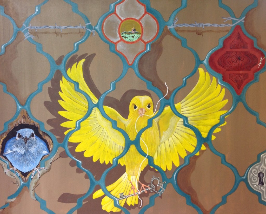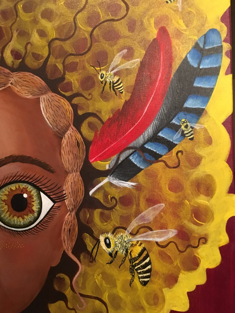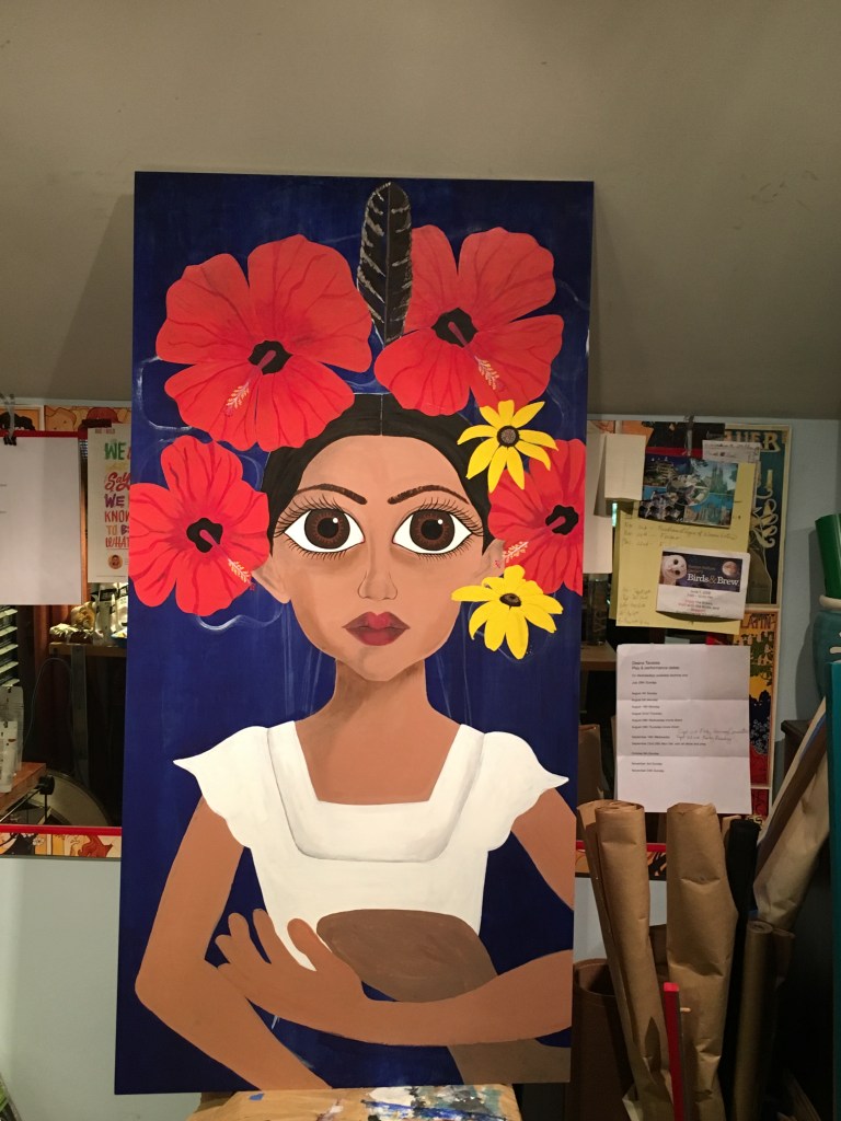 The bold colors of the acrylic always set my imagination free. Most of my images start with a very simple concept like a vision of a yellow bird, inspiration in nature, or dream worlds. Once that image is on the canvas the rest begins to take shape organically around it and new inspiration finds its way in as the days unfold. Social issues also greatly influence my work along with underrepresented groups within our society. I look at each one of these humans as a representations of all of humanity and at the same time self portraits as well. After all we are all interconnected! I believe that it’s important to see ourselves within one another.