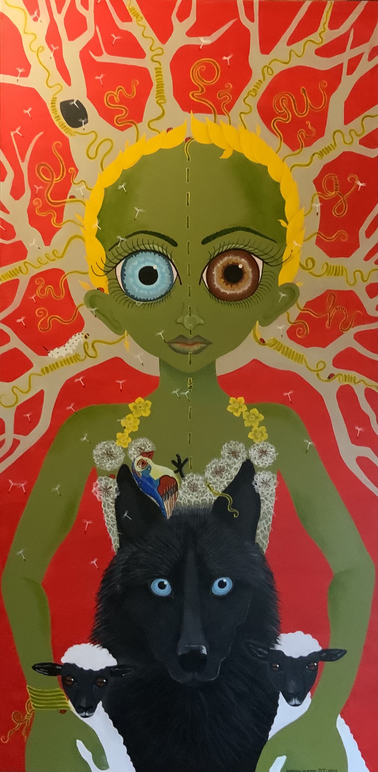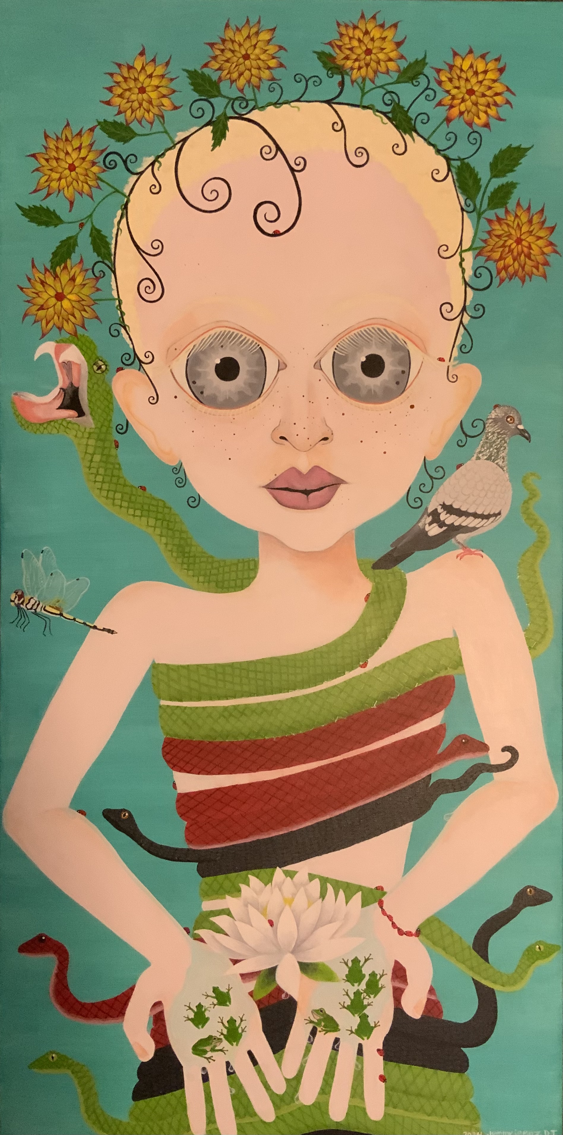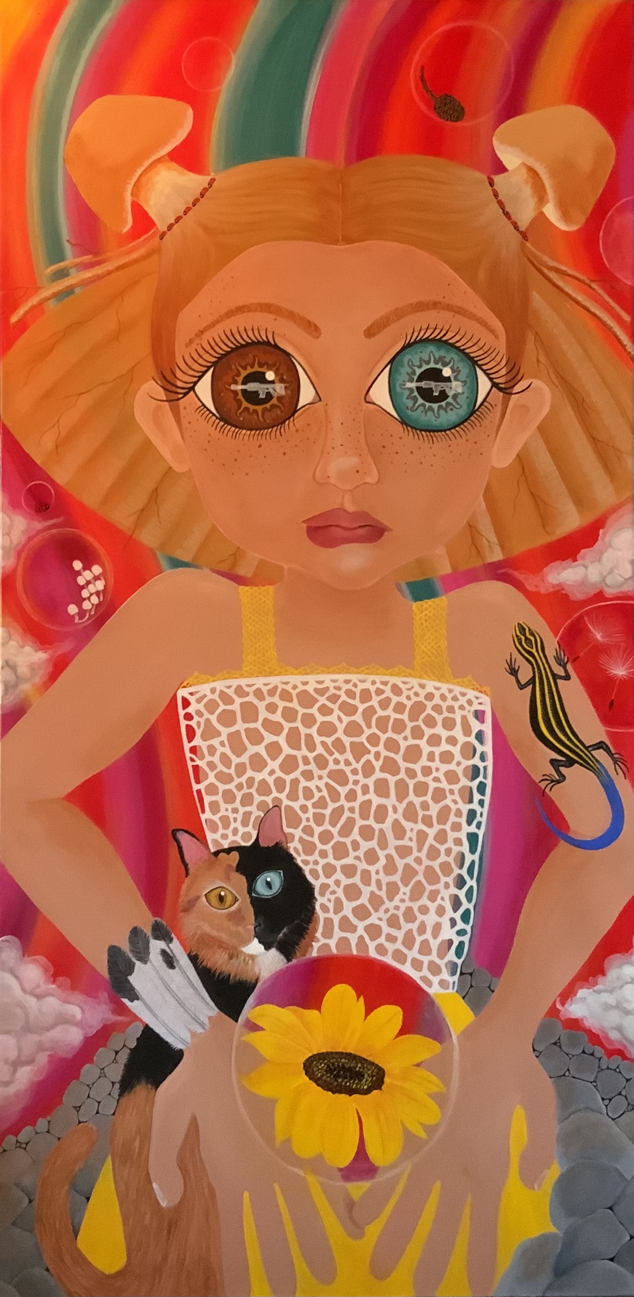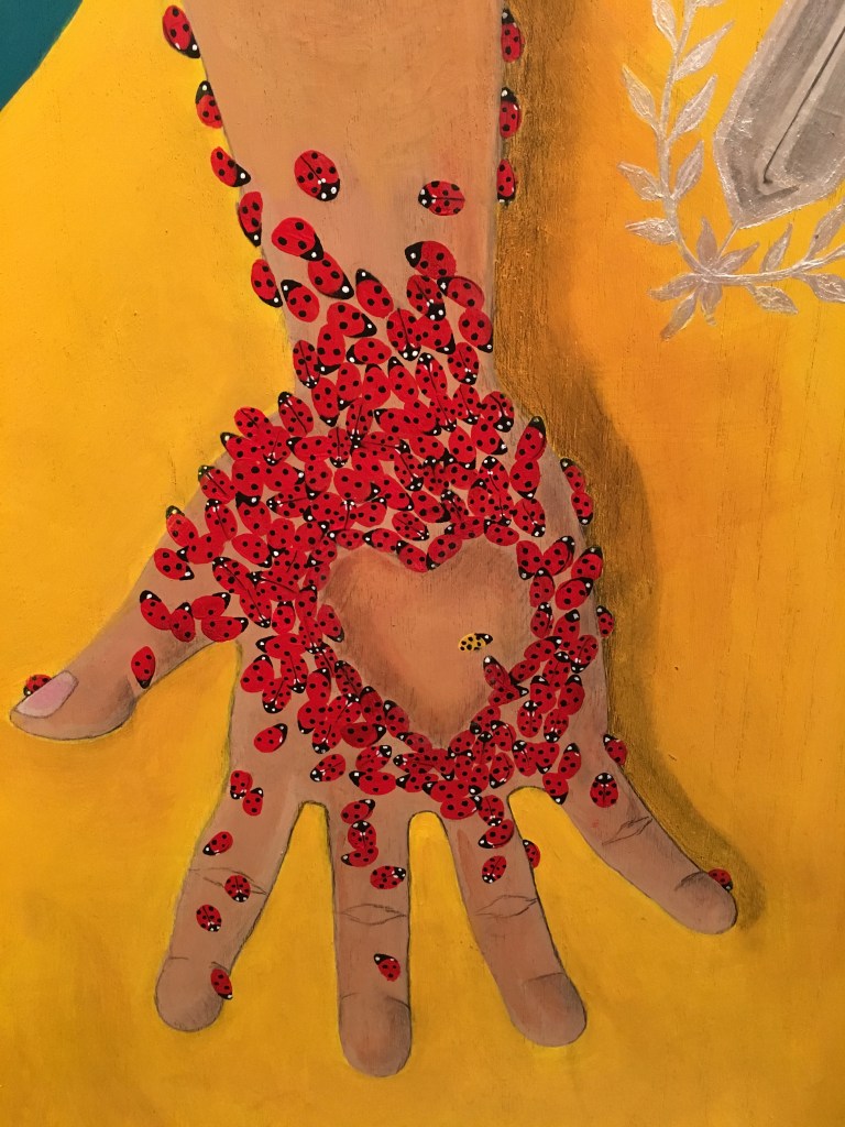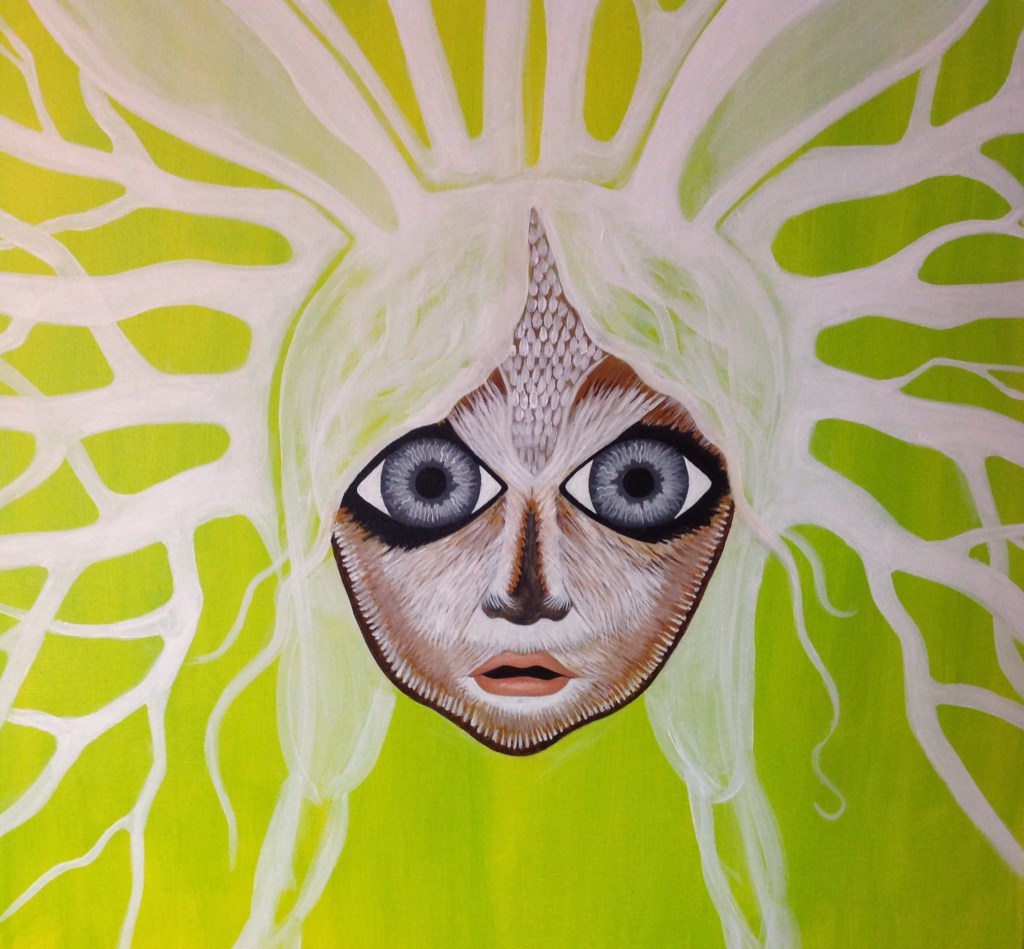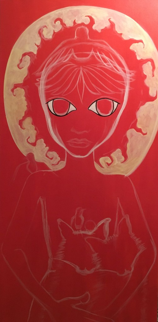 The bold colors of the acrylic always set my imagination free. Most of my images start with a very simple concept like a vision of a yellow bird, inspiration in nature, or dream worlds. Once that image is on the canvas the rest begins to take shape organically around it and new inspiration finds its way in as the days unfold. Social issues also greatly influence my work along with underrepresented groups within our society. I look at each one of these humans as a representations of all of humanity and at the same time self portraits as well. After all we are all interconnected! I believe that it’s important to see ourselves within one another.