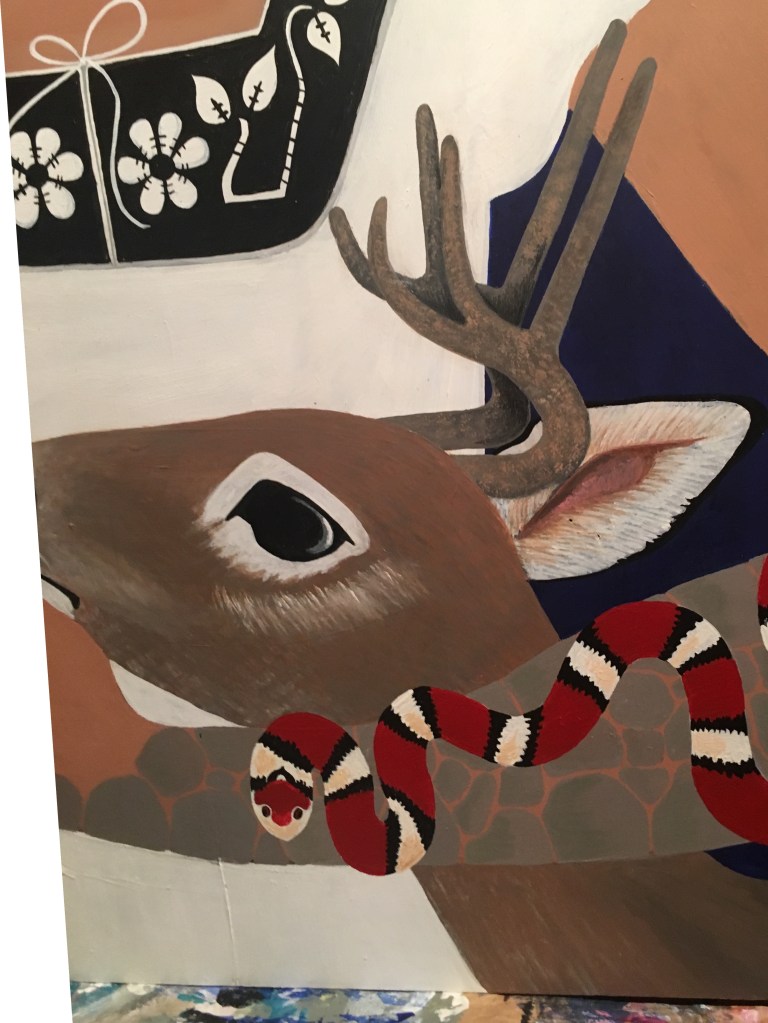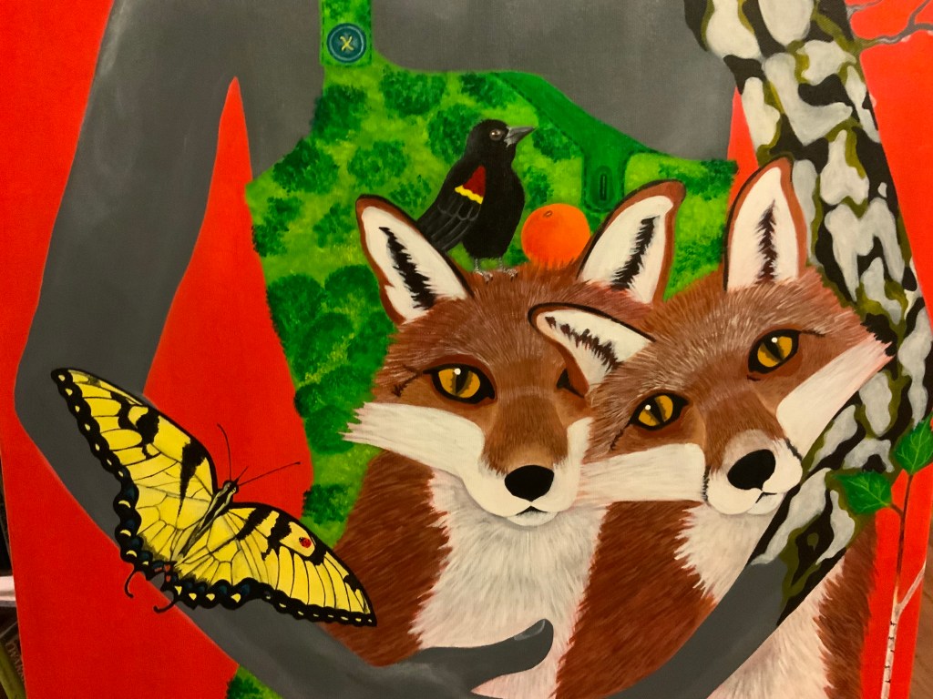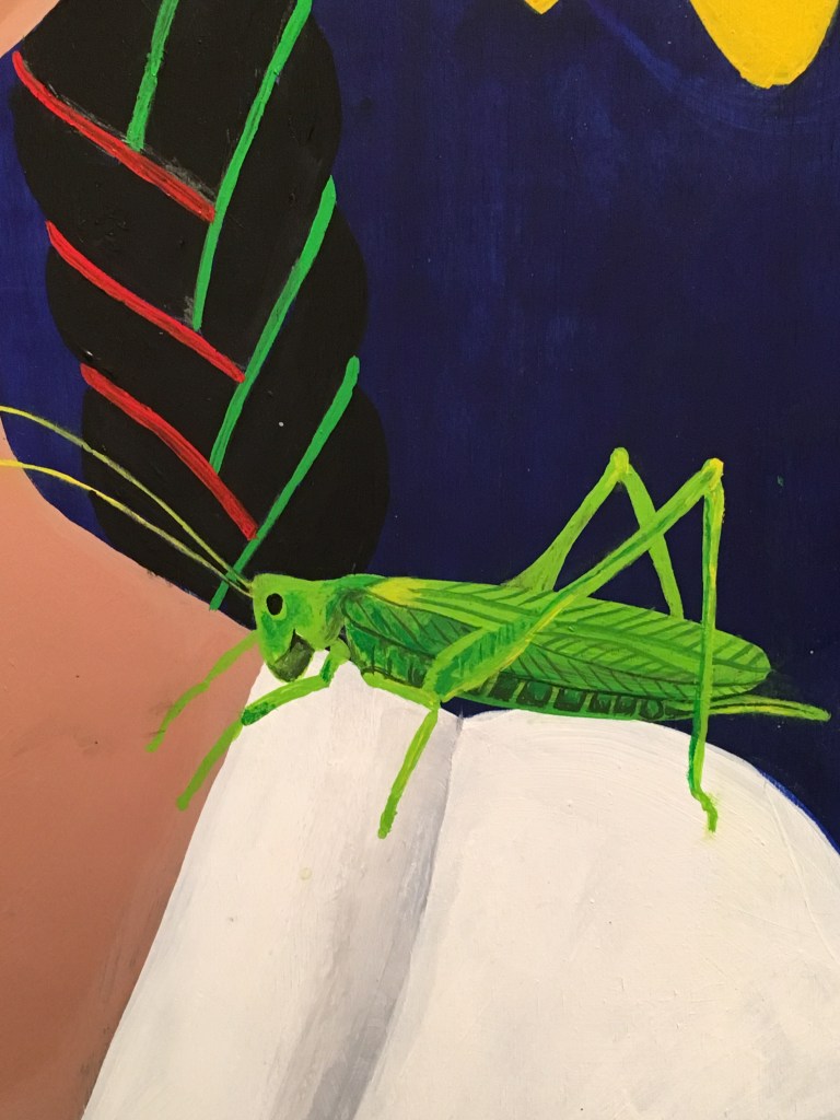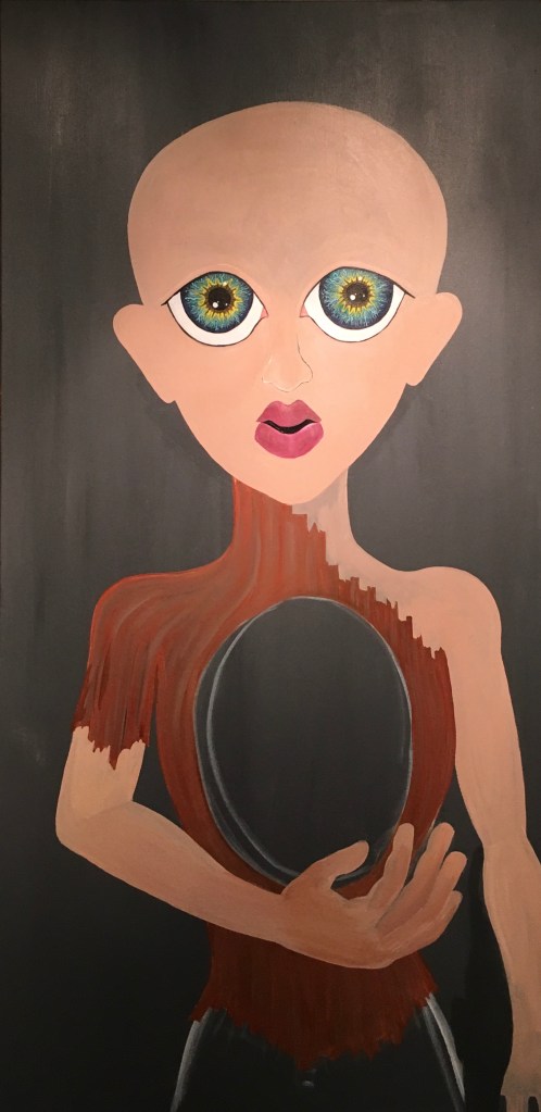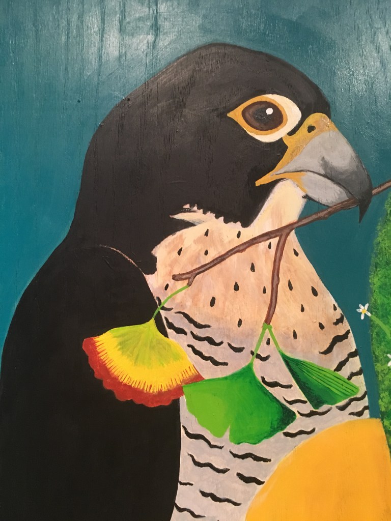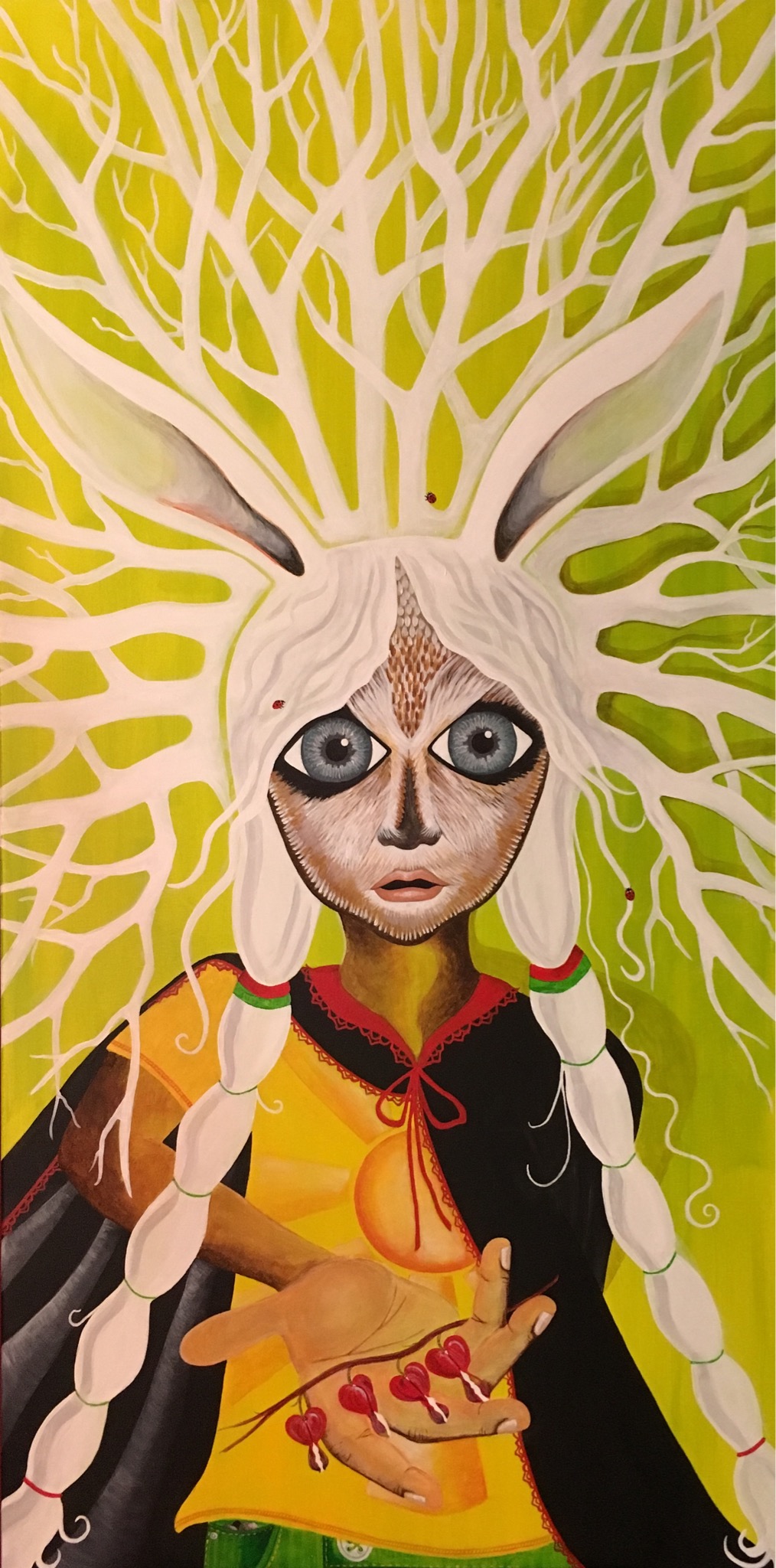 The bold colors of the acrylic always set my imagination free. Most of my images start with a very simple concept like a vision of a yellow bird, inspiration in nature, or dream worlds. Once that image is on the canvas the rest begins to take shape organically around it and new inspiration finds its way in as the days unfold. Social issues also greatly influence my work along with underrepresented groups within our society. I look at each one of these humans as a representations of all of humanity and at the same time self portraits as well. After all we are all interconnected! I believe that it’s important to see ourselves within one another.